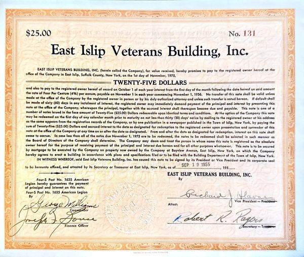 In 1955, the veterans of East Islip issued $25 bonds like this one to raise funds for a new American Legion hall. Neighbors and local families purchased the bonds, each earning 4% interest, but more importantly, helping to turn a dream into reality.